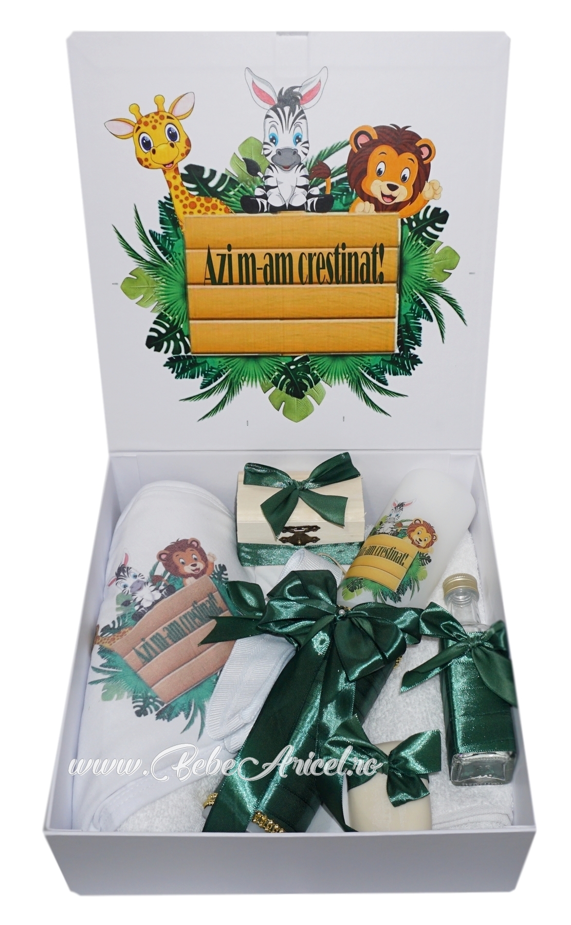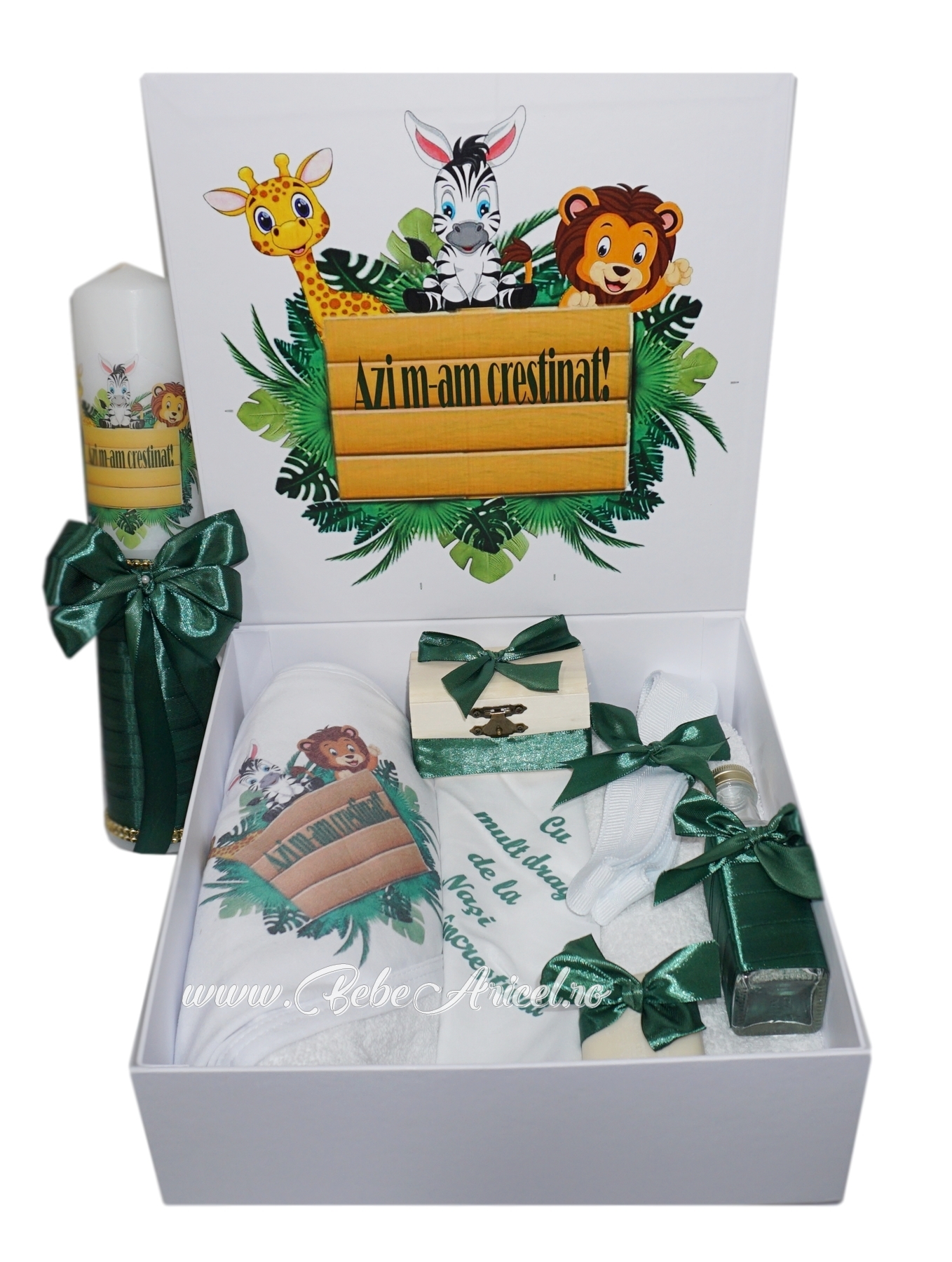 Pachet 9 piese: trusou pentru botez, cutie pentru trusou si lumanare pentru botez - JUNGLE, SAFARI